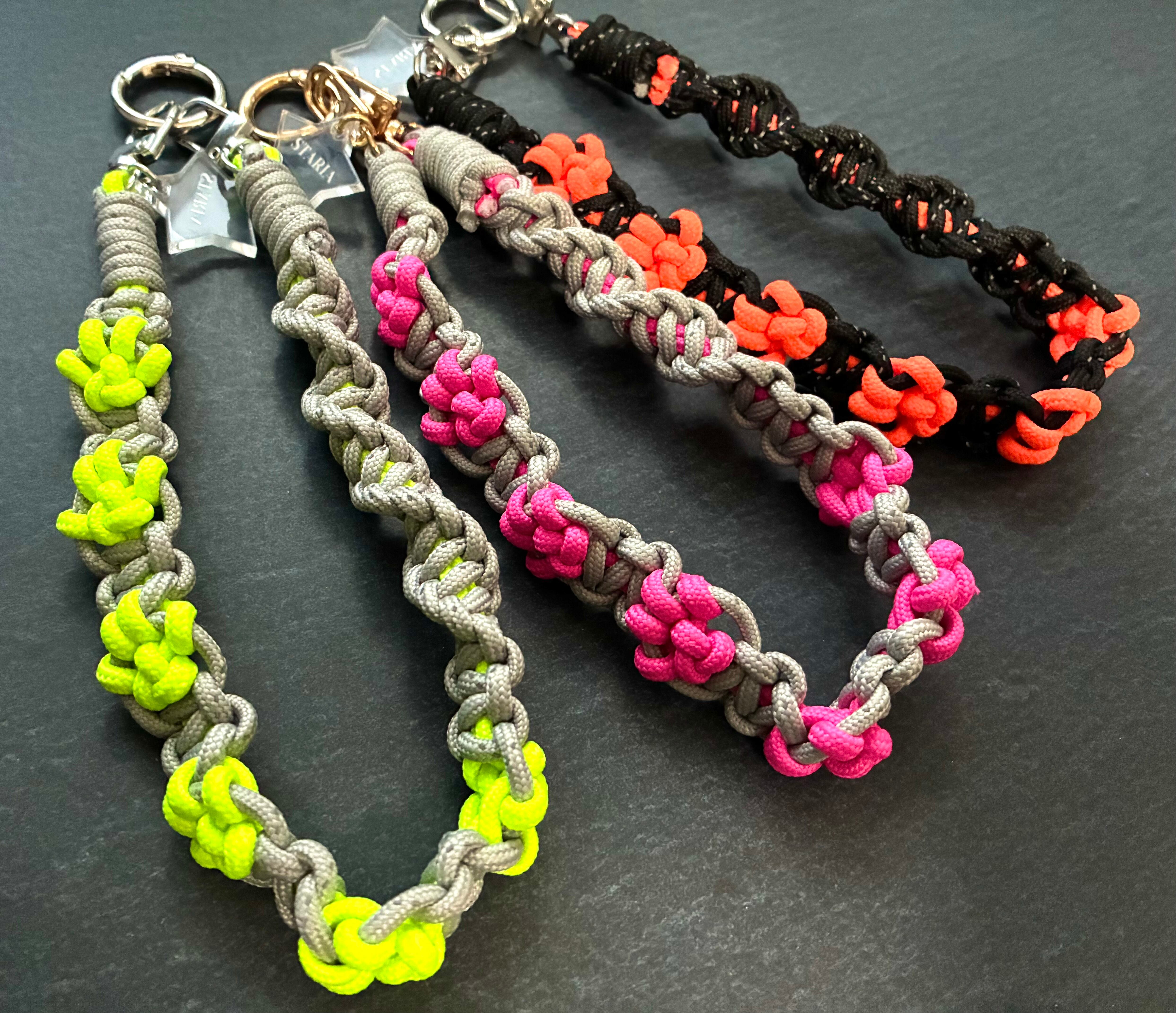 アウトドアで使用される耐久性のあるパラコード(アウトドアコード)を編んだショートストラップです。